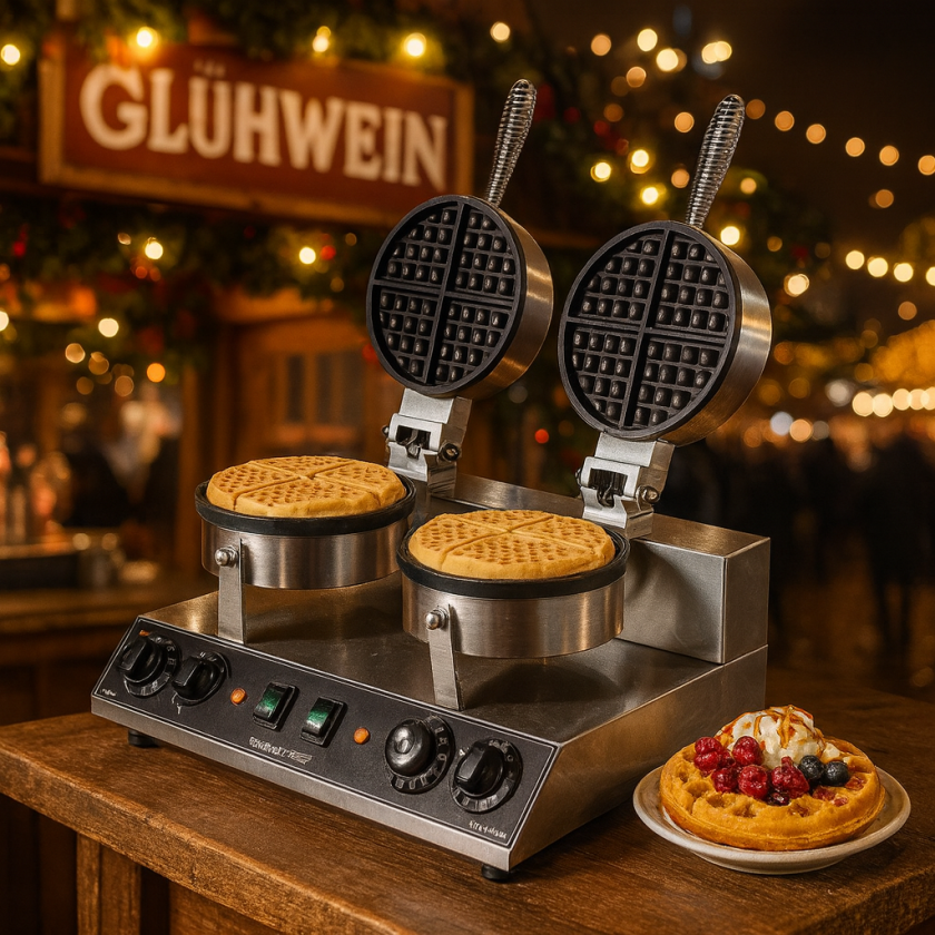 Dieses leistungsstarke Doppel-Waffeleisen aus Edelstahl ist die perfekte Lösung für Veranstaltungen, Foodtrucks, Weihnachtsmärkte und Catering-Events. Mit zwei separat steuerbaren Backeinheiten ermöglicht es die gleichzeitige Zubereitung von zwei frischen, goldbraunen Waffeln – ideal, wenn es schnell gehen muss und Qualität gefragt ist.
