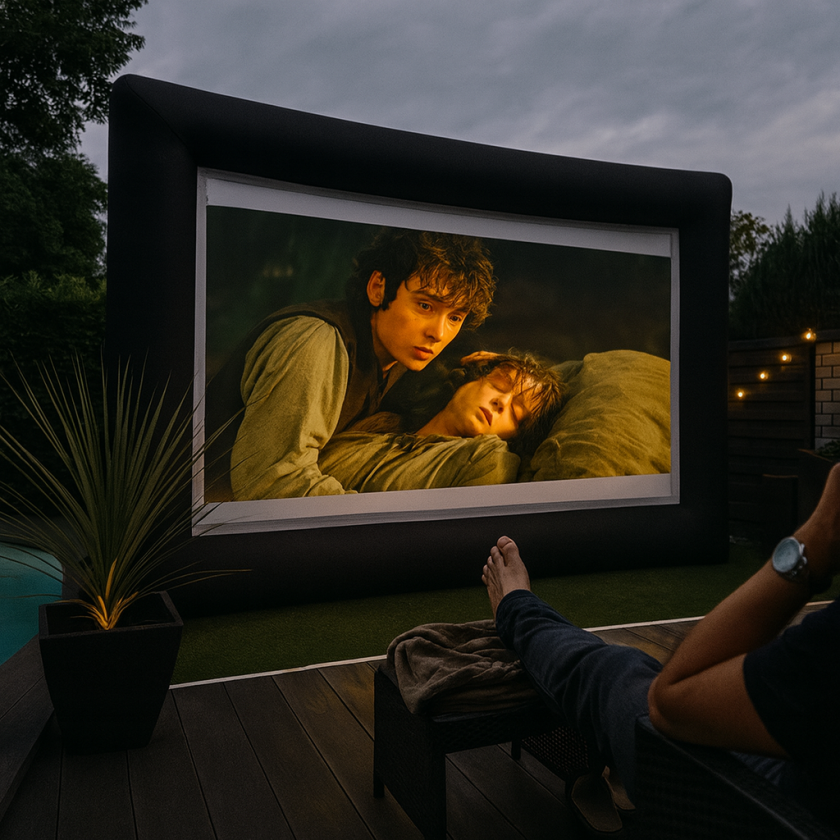 Diese beeindruckende aufblasbare Großleinwand mit einer Breite von 6 Metern und einer Bilddiagonale von 180 Zollverwandelt jeden Garten, jede Terrasse oder Eventfläche in ein echtes Open-Air-Kino.